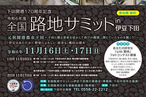 「全国路地サミットin伊豆下田」開催 全国路地のまち連絡協議会が主催している「全国路地サミット」ですが、下田開港170周年記念で、下田で開催されることが決定しました。 年に一度、2003年の東京十条をかわきりに、全国の路...