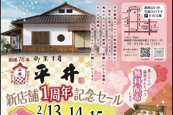 「平井製菓」で新店舗1周年記念セール 創業77年の歴史を誇る下田市の老舗菓子店「平井製菓」。 2025年2月14日(金)より西本郷に新店舗をオープンされましたが… 2月14日(土)で新店舗オープン1周年を迎えられます。 ...