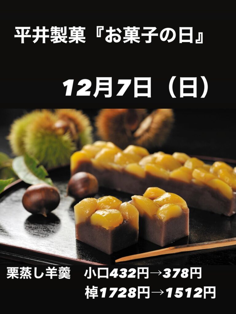 2月14日(金)より西本郷に新店舗をオープンされましたが、そんな「平井製菓」の今月のお菓子の日は12月7日(日)で、今回の特別価格商品は栗蒸し羊羹となっています。