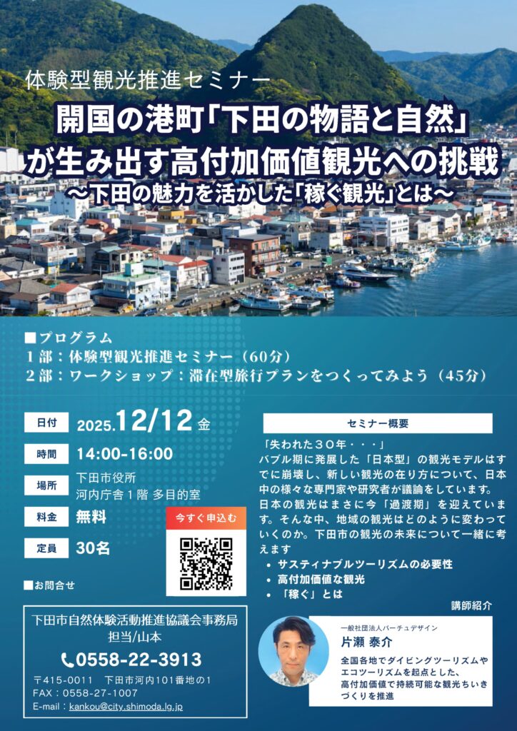 もくじ開国の港町「下田の物語と自然」 が生み出す高付加価値観光への挑戦「下田市役所河内庁舎」の概要はこちらから 開国の港町「下田の物語と自然」 が生み出す高付加価値観光への挑戦 下田市役所河内庁舎1階の多目的室で、観光関連事業者様向けに、体験型観光推進セミナー「開国の港町「下田の物語と自然」 が生み出す高付加価値観光への挑戦」が開催されます。 引用元:下田市役所 興味のある観光関連事業者様は、ぜひチェックしてみてくださいね。 「下田市役所河内庁舎」の概要はこちらから 引用元:下田市役所 下田市役所河内庁舎 住所 静岡県下田市河内101ー1 電話 0558-22-3911 公式サイト ※正式な情報はお確かめください 投稿者プロフィール ペリーやまもと 最新の投稿 投稿者アーカイブ 未分類2026.01.15下田市民文化会館で令和8年「下田市二十歳の集い」が開催される スポーツ2026.01.14「敷根公園」敷根フィットネスクラブで限定トレーニング教室「快活!ストレッチ教室」開催、1月28日(水)と2月18日(水) 買い物2026.01.13期間限定!「下田ロープウェイ」で寒桜の御朱印を販売中 楽しむ2026.01.12下田市民文化会館で「Amateur Band Festival 2026 in Shimoda」開催、4月19日(日)
