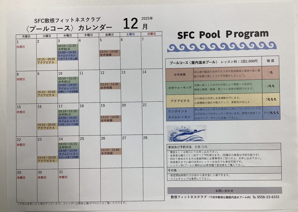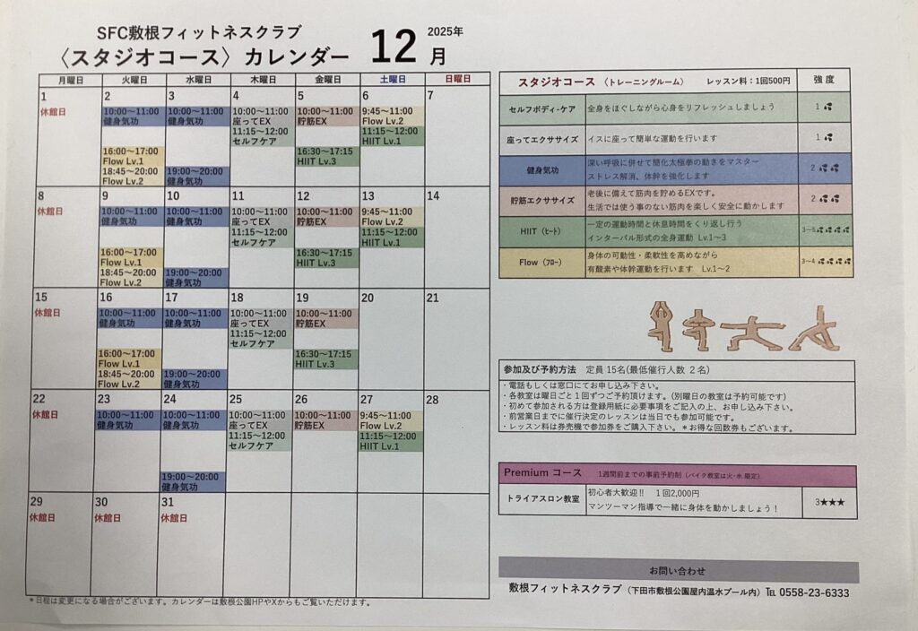 敷根フィットネスクラブ12月のレッスンスケジュール