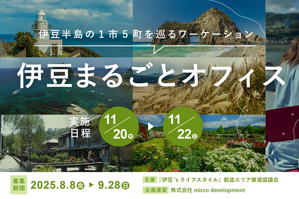 伊豆’sライフスタイル創造エリア推進協議会が、伊豆まるごとオフィス〜伊豆半島の1市5町を巡るワーケーション〜の参加者を募集しています。